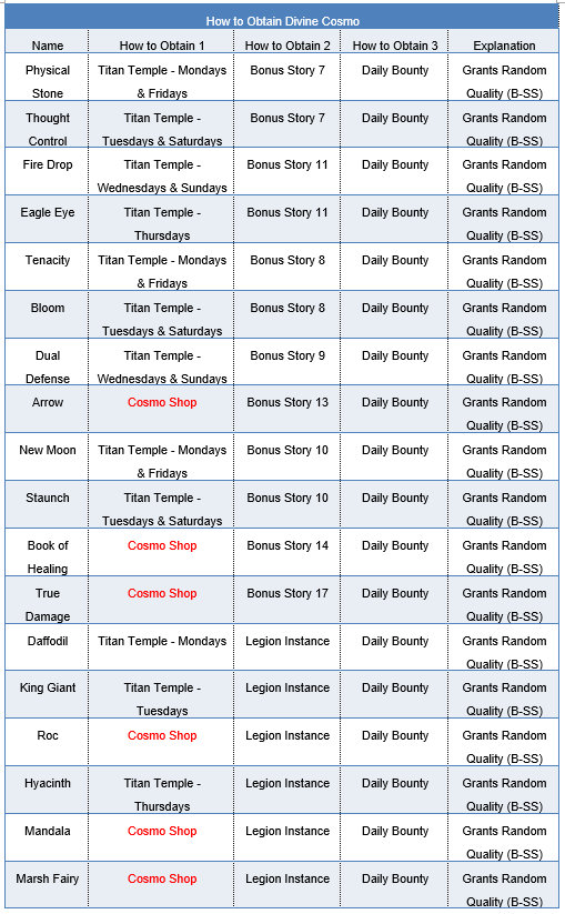 Titan Temple unlocks upon reaching account level 21. Titan Temple drops vast amounts of Cosmo. Another way of acquiring Cosmo is from Daily Bounty which unlocks at level 23. These are your two main ways of obtaining Cosmo. The Legion Instance also has a chance to drop Cosmo.