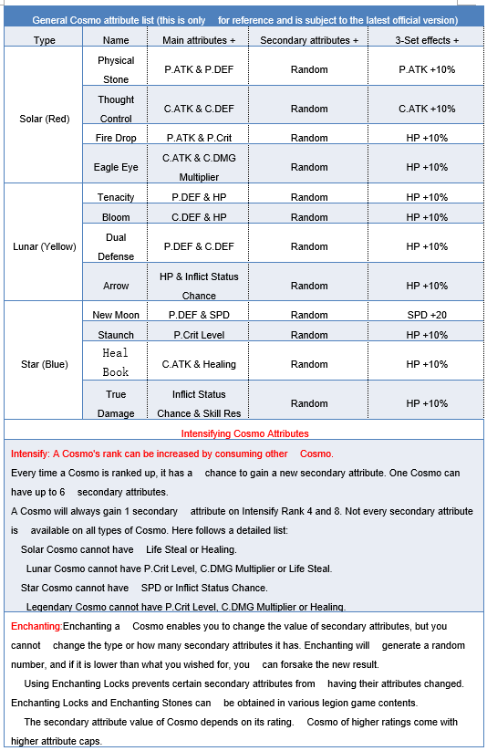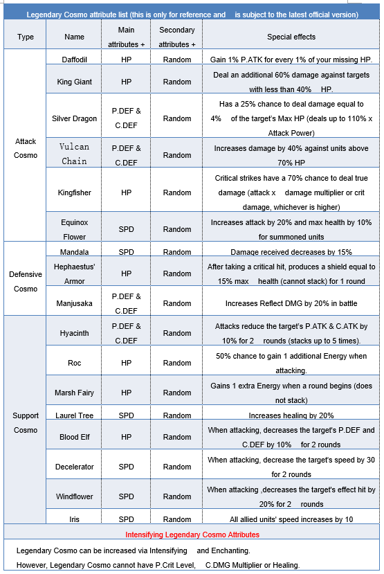 Legendary Cosmo grants basic attributes and special battle effects.