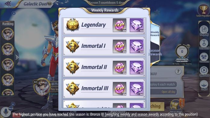 Includes PvP ladder and seasons. Apart from normal battle rewards, extra rewards are granted at the end of every season (large amounts of Diamonds). Tap on the PvP button in the bottom-right corner and then on the Galactic Duel icon to enter or talk to NPC Camus in Town. It is available every day between 12:00 - 13:00 & 20:00 - 21:30.