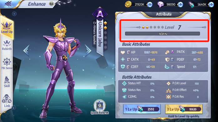 Leveling up a Saint greatly increases its basic attributes such as HP and P.DEF (SPD doesn’t increase with level). The quickest way to gain levels is to drink Saint EXP Potions, which can be gained in the experience instance—Ancient Ruins. You can also get large amounts of them through normal battles and daily events.