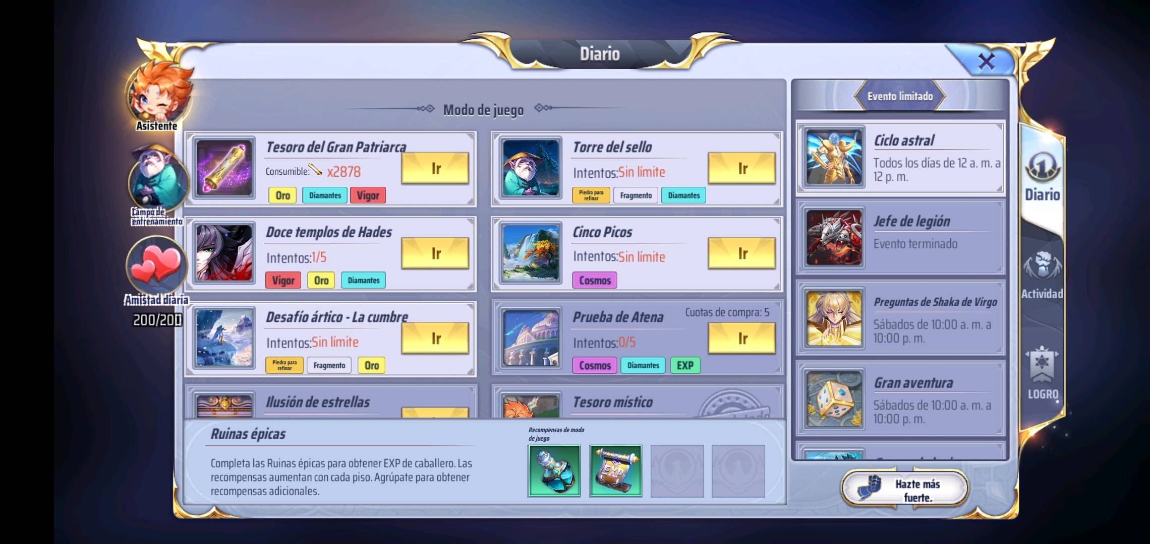 Cuando nos salen los banners el último día a última hs, no nos alcanzan esos 200 de amistad para poder hacer el entrenamiento, mucho menos si es un caballero SS que pide nivel 4 para poder abrir todo el 8vo sentido y así reclamar todo el entrenamiento.