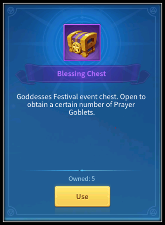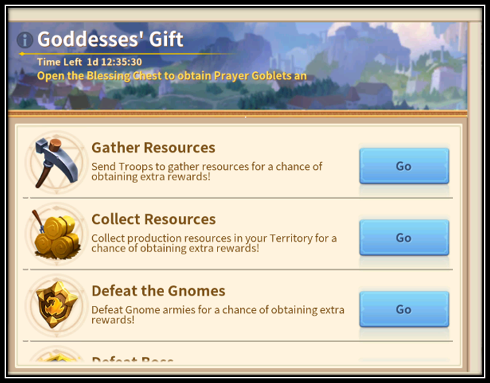 This sub-event provides Blessing Chests to players for their in-game activity, such as eliminating Gnomes, Gathering resources in the world map or in your territory, and by defeating World Bosses. The rewards inside of the Blessing Chest are some resources packs and Prayer Goblets that can b utilized in the Divine Blessing sub-event.
