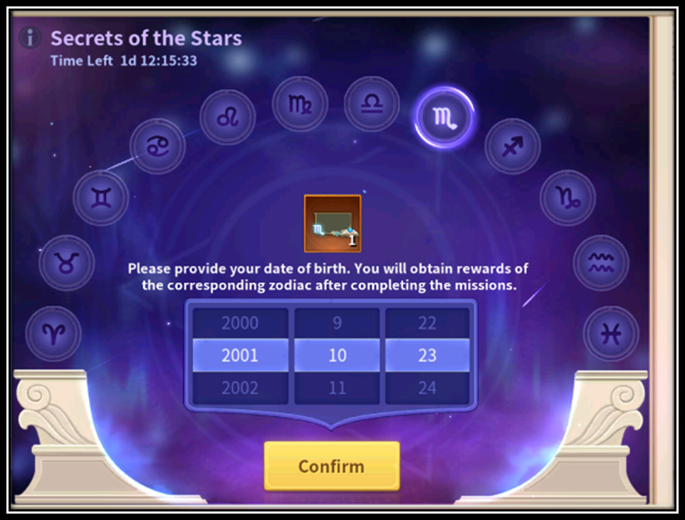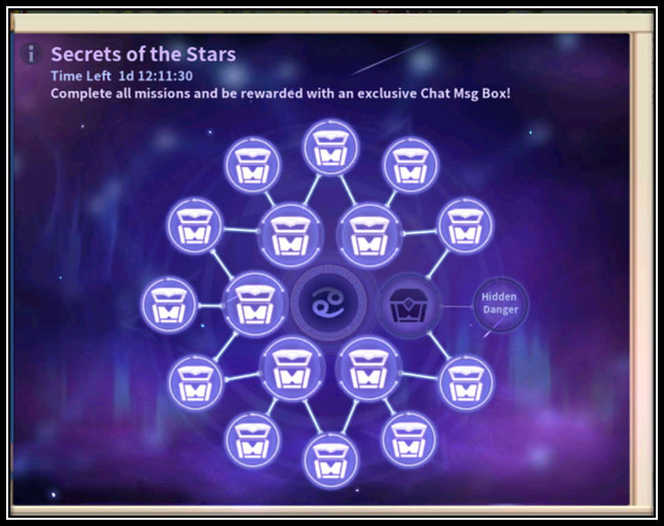 This is a very unique sub-event where players pick their birthday date and gain a custom quest line that rewards a chat box decoration based on the month of the player's birthday. To receive their unique reward, players must accomplish a series of missions, each wither their own unique and awesome reward, once all missions are accomplished the custom chat box is unlocked for the the player.