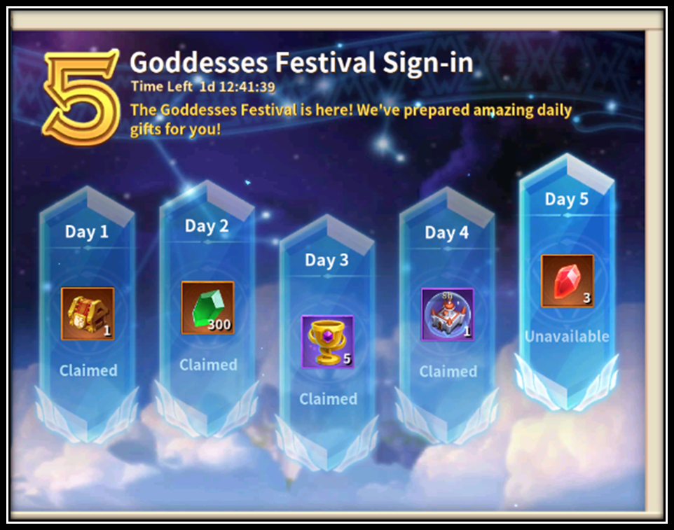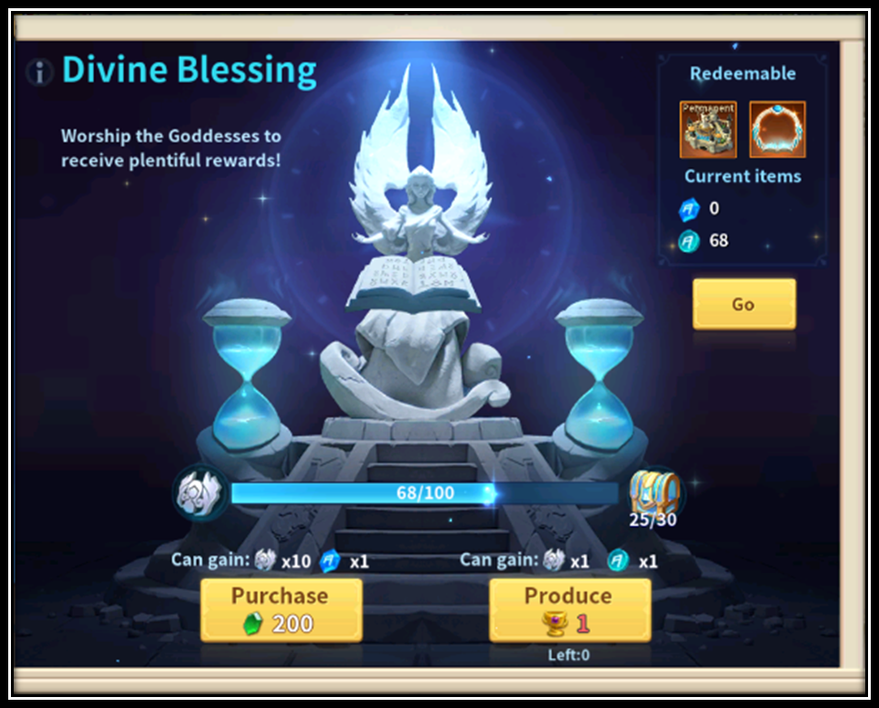 Here you can utilize your Prayer Goblets to worship the Goddesses, this will reward one Worship point and Star Souvenir Coins, which you can exchange for some nice rewards. You can also worship with 200 gems, which will provide 10 Worshiping Points and 1 Divine Crystal that you be used in the next section of the event. When you reach 100 worshiping points, you gain the right to open a chest containing a variety of resources or speedups as rewards.