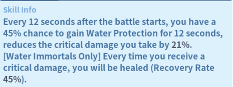 Water protection will reduce critical damage taken by protection up to 70%!, if you are using a water team it will give you a shield that will recover health bar up to 150% if the opponent deal critical damage.