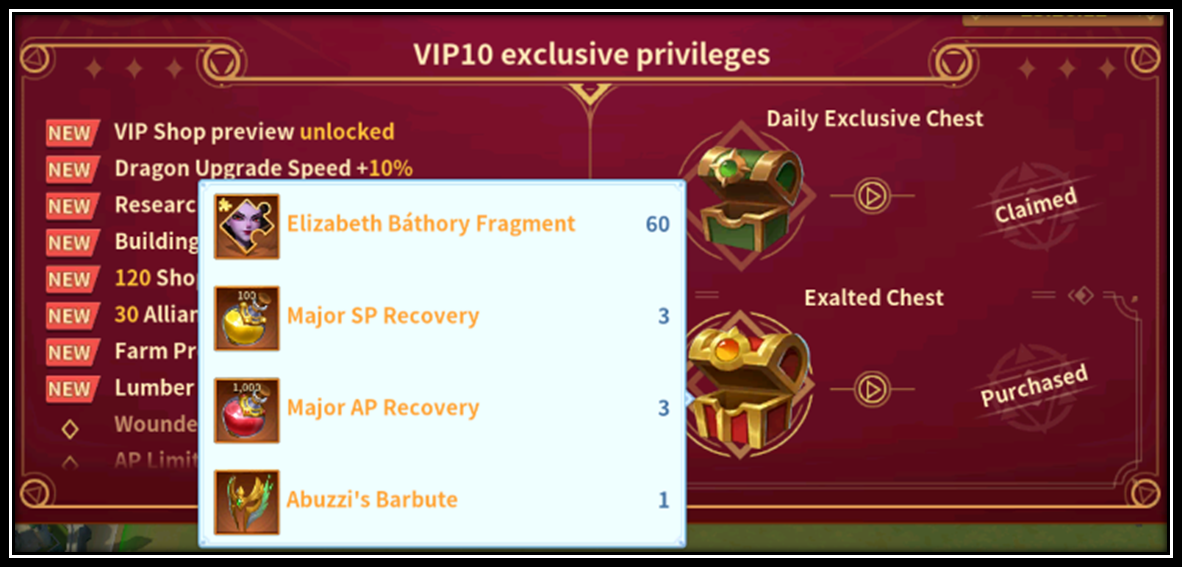 To acquire Elizabeth Bathory, there is a very important requirement, the player must reach VIP level 10, which will unlock the exalted chest, that contains 60 Elizabeth Bathory Fragment. It is also important to highlight the great bonuses that players receive from reaching VIP 10, such as a free Philosopher's Stone every day.