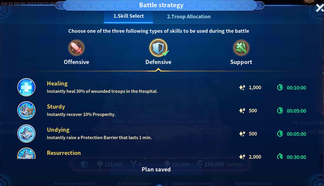 Make sure to fill in the strategy you'll utilize after you've entered the team! I'm here as a player that won't be using speed-ups, so I'll be focusing on defensive metrics. Why should you be defensive? This method is very perfect for those of you who do not want to spend an accelerator. This is because defensive techniques can cure troops in the game for free without the usage of an accelerator! This is because this technique has the benefit of allowing you to use your defensive status after you reach a particular energy point. Healing, Sturdy, Undying, and Ressurection are the four types of defensive status that can be utilized on the battlefield.