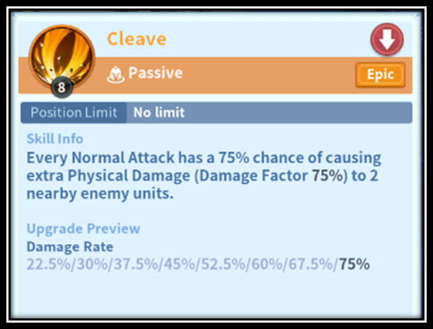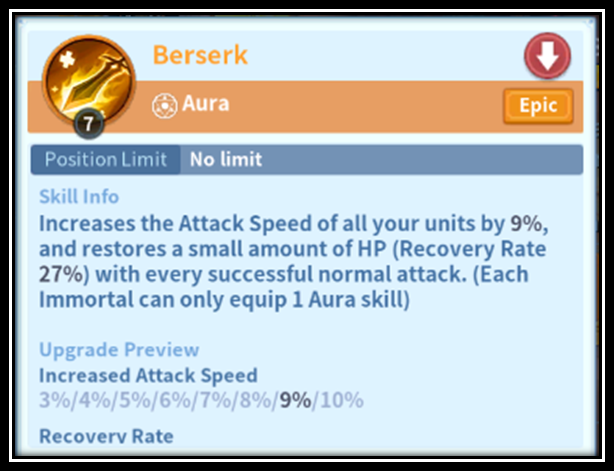 - Berserk: the third skill is always very relative, my personal taste is to usually utilize an aura that further enhances Barcas's offensive capability, and this is the one that has the best synergy in my opinion, because this skill will further increase their hit frequency, and consequently increase the activation rate of your cleave and all other activation skills, and on top of all that Berserk will also add up to 30% normal attack life steal.