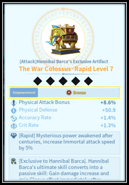 Hannibal Barca is a great immortal, is very easy to be obtained, and also super flexible with skills, he adds a lot of value to skills that are not so useful for other marches, and will be causing enormous damage to your enemy, specially if you obtain a good exclusive artifact. If you have any questions or suggestions, please leave a comment below.