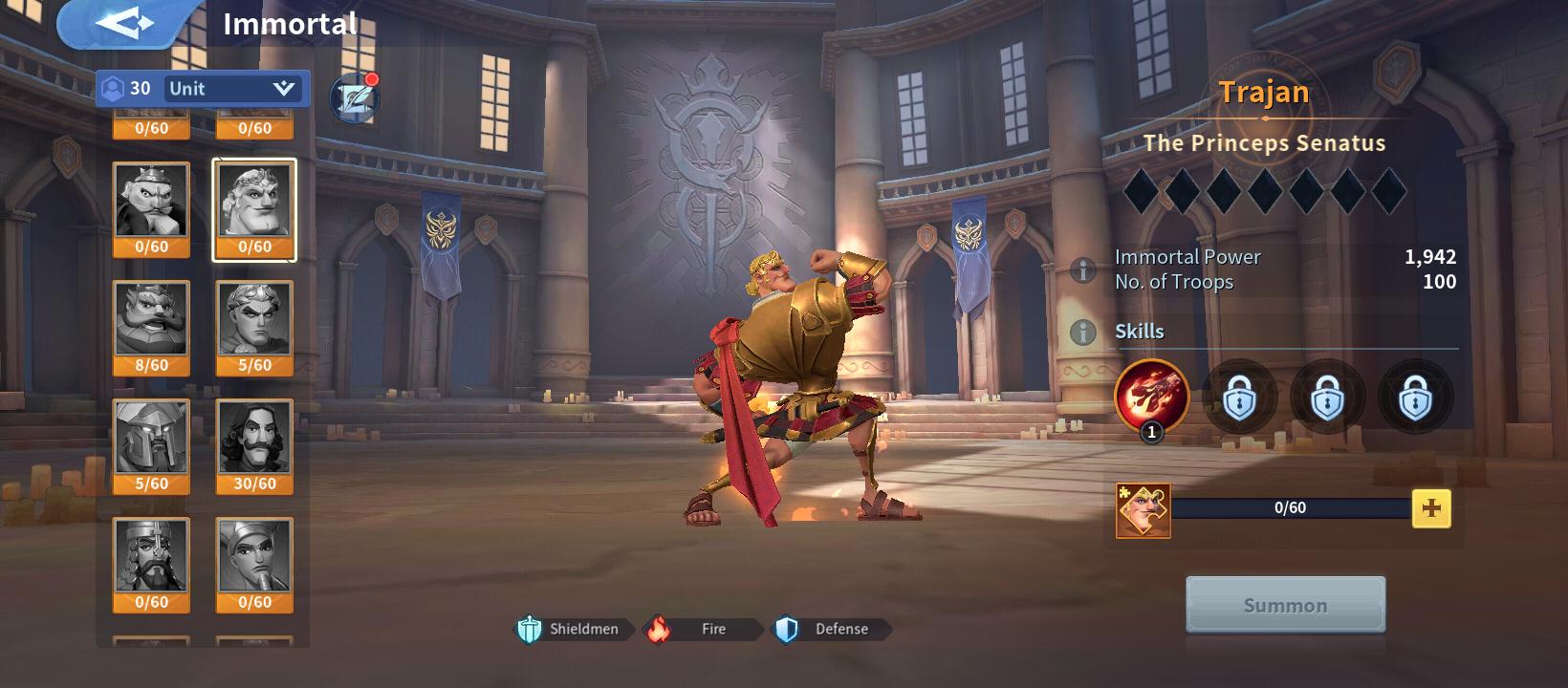 Trajan is an exclusive fire Immortal that can only be obtained through KvK boxes after season 3. He is a front liner and he has a defense status, therefore it is highly recommended to use support skills to help damage dealers deal massive damage.