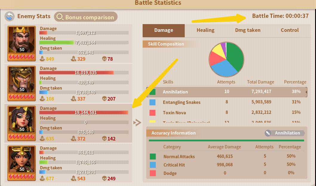 Cleopatra's main skill is called Entangling Snakes. This skill is very useful for reducing enemy magical damage. She can reduce the enemy's magical damage up to 35%, besides that she can deal damage up to 300%!