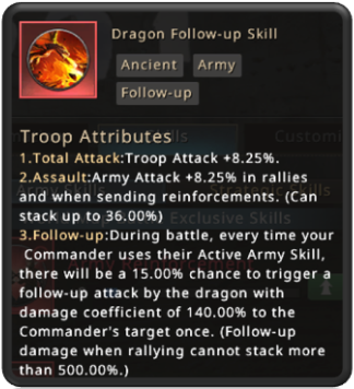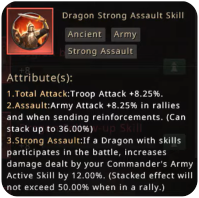 “Dragon Strong Assault Skill” increases all our commander’s AAS by 12% (originally if we use a 4-star commander, then she/he has 260%). Additionally, this skill also offers Total Attack.