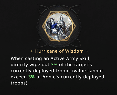 Whenever our commanders (both male and female) use their Active Army Skill, Cersei can cast “Disarm” effect while causing extra damage through ‘Wildfire’ attack.