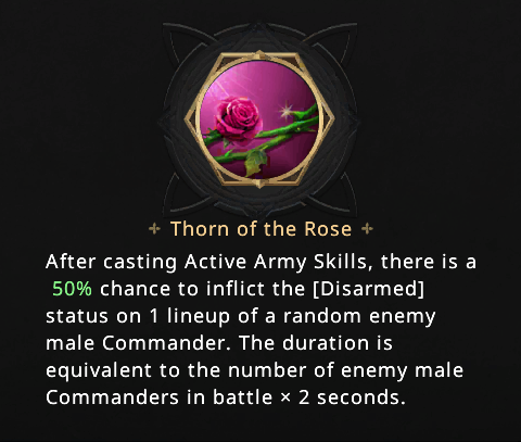 On similar front, Margaery also casts “Disarm” status on 1 random enemy male commander (time depends upon the enemy male commanders count in the lineup)