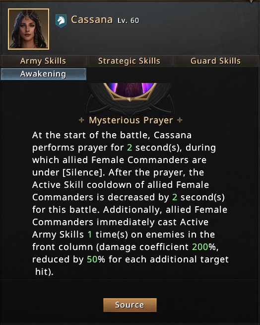 Salma’s Awakening skill allows all female comms to have 80% chance to use their Active Army Skill once in the beginning of the battle (at 1 second) and this can trigger Leila’s Awakening skill and often because of this loop, enemy suffers heavy damage in the beginning itself.