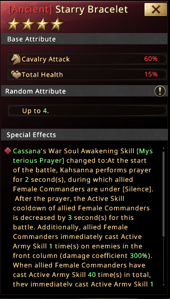 Leila’s weapon improves her awakening skill and increases the probability of Active Army Skill being used again. This is the most important feature because it not just benefits Leila, but the entire lineup and other 4 commanders to perform better.