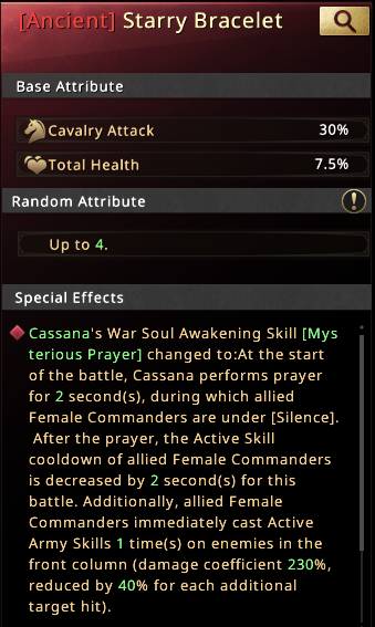 So, Senelle can purify Bleed, Silenced and Disarmed effects caused by other commanders. Also, another amazing quality for Senelle is that she is most suitable for Cav players as she offers ‘Cavalry Anti-Counter’ stats, i.e. Enemy spearmen will deal less damage to your allied cavalry.