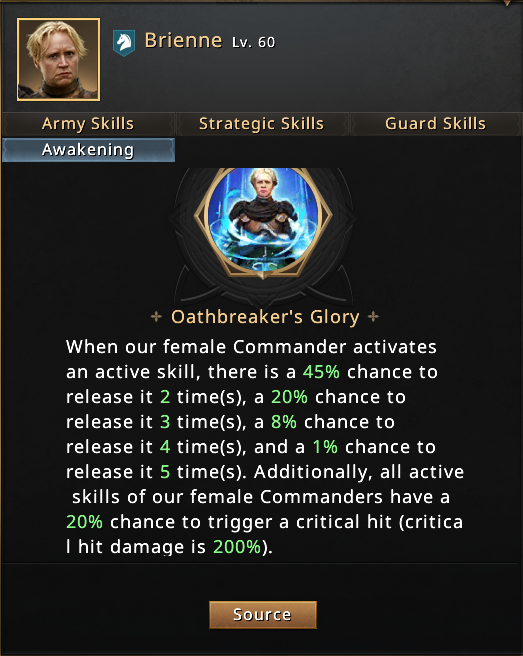 Recently, another Female commander, Brienne was added to the game who is potentially an improved version of Leila Mormont. Brienne, just like Leila also enables Female Synergy however, both their skills cannot be activated simultaneously. Brienne's skills improve probability for repeating active skills for all the Females, compared to Leila and also, additionally provides 20% chance to trigger a 'Critical hit' with damage coefficient of 200%.