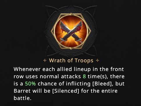 Barret is another commander who can inflict ‘Bleed’. He doesn’t provide much Inf attack stats and so he is not a very great choice but he is still a pretty good choice because of his skill.