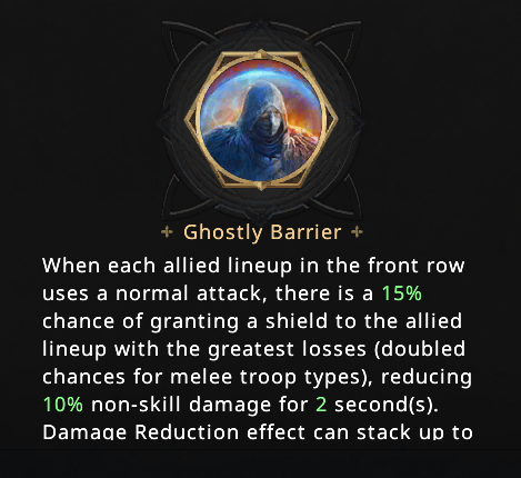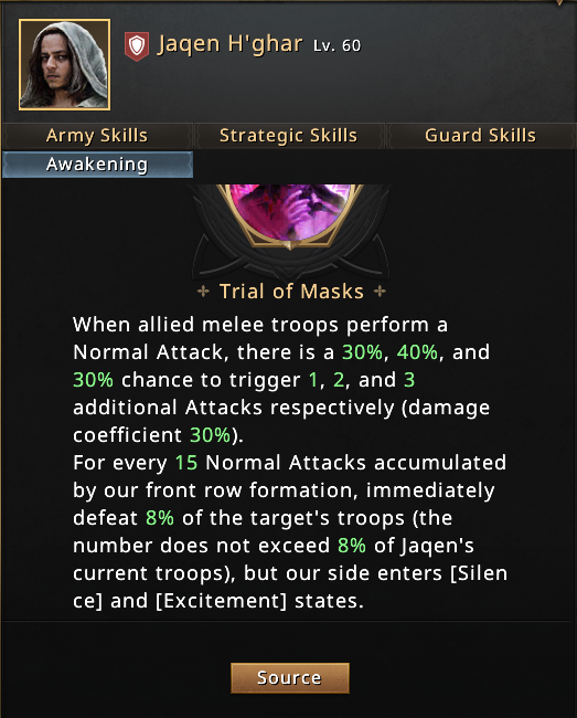 Jaqen helps in triggering additional attack (1, 2 or 3 times) which helps deal extra damage to the enemy lineup. Also, for every 15 normal attacks, it immediately defeats 8% of the target's troops.