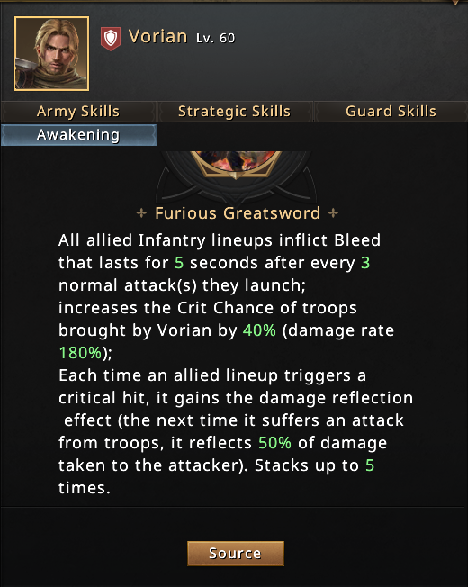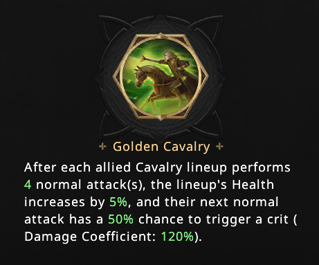 Merrel is also a ‘Crit’ commander with Crit coefficient of 120%. Since in Bleed setup, we can use just inf or cav troops for max benefit, Merrel is a very good choice if anyone wants to play cav troops.