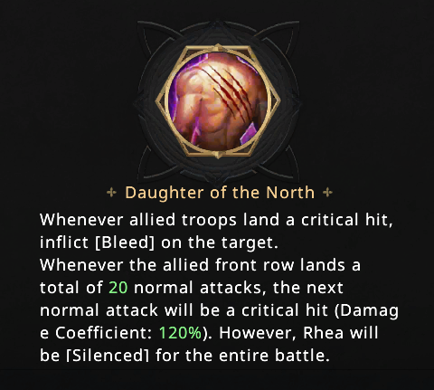The Bleed/Crit setup is built around Sinara and her 4-star awakening skill “Fearless Advancement”. Her awakening skills prevent all the ally commanders from casting their Active Army skill or initiate Weakness Attack. Because of this reason, Bleed synergy cannot be mixed with Leila’s female synergy or Jaime’s Weakness Attack synergy.