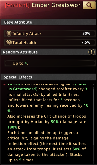 Another skill is called “Dragon Bleed Skill” which increases the ‘Bleed’ damage done by our troops by 10%. This results in higher damage being dealt to the enemy whenever any commander inflicts Bleed.