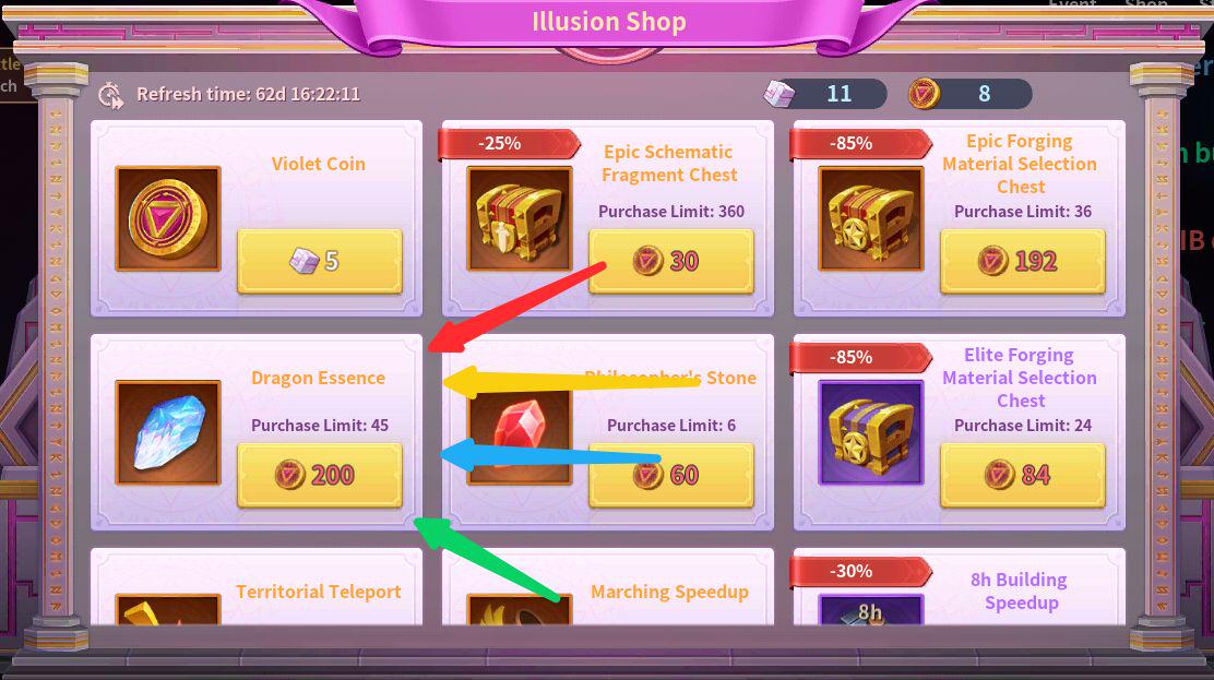 The Illusion Shop is a place to buy items such as acceleration speed ups, artifacts, and philosopher stones, but in the 2.3 update this feature added Dragon Essence as one of the items offered for free!
