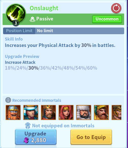 Onslaught is a must-have skill in the early game, because this skill can increase physical attack with a basic status of 18%. I suggest taking this skill up to level 4, because this skill will be used for the second or third team later.