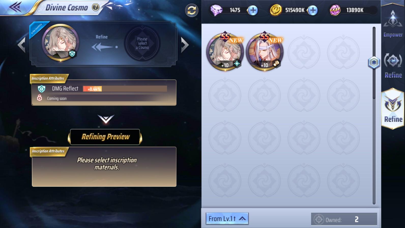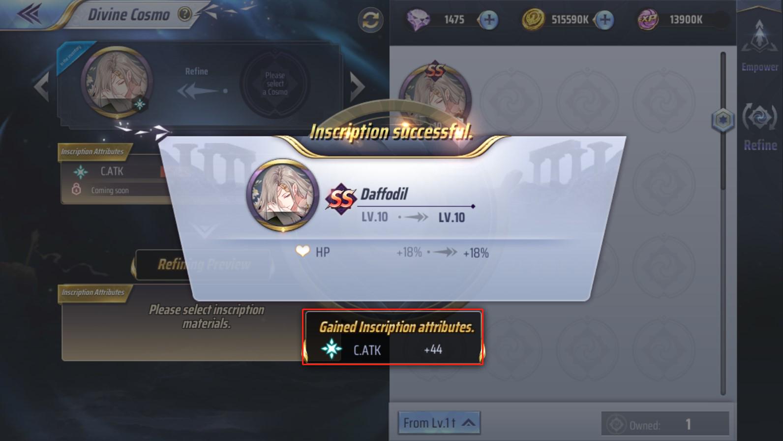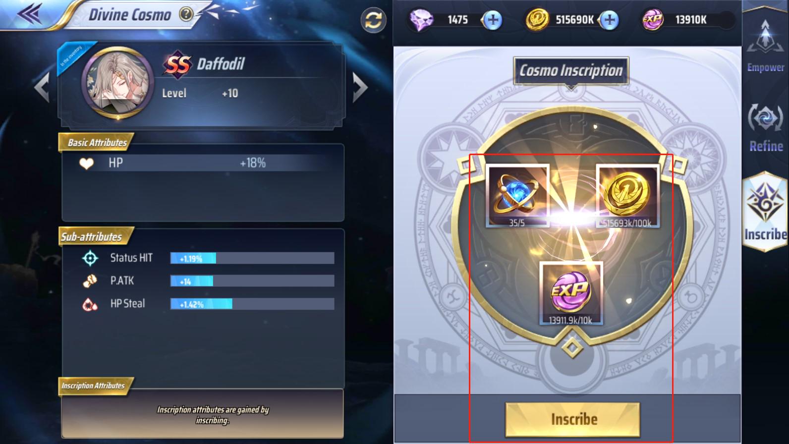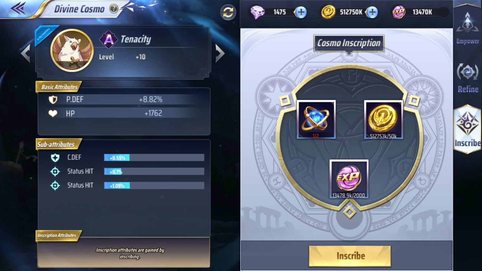 Inscribed Cosmos can be refined. Refinement costs an inscribed Cosmo that is of the same quality and slot of the Cosmo being refined, Gold, and Divine Essence (consumed Cosmo will disappear upon refinement).