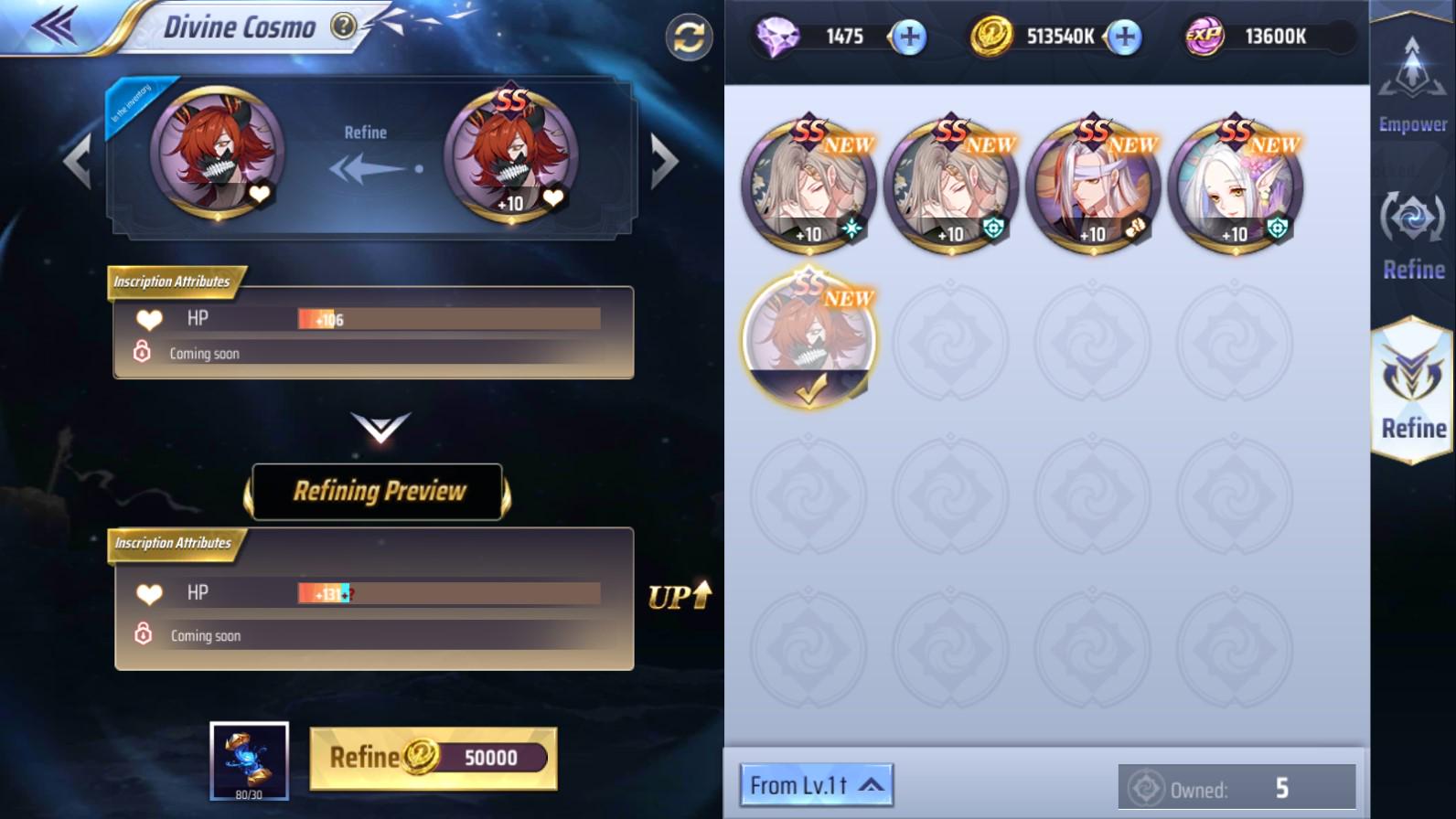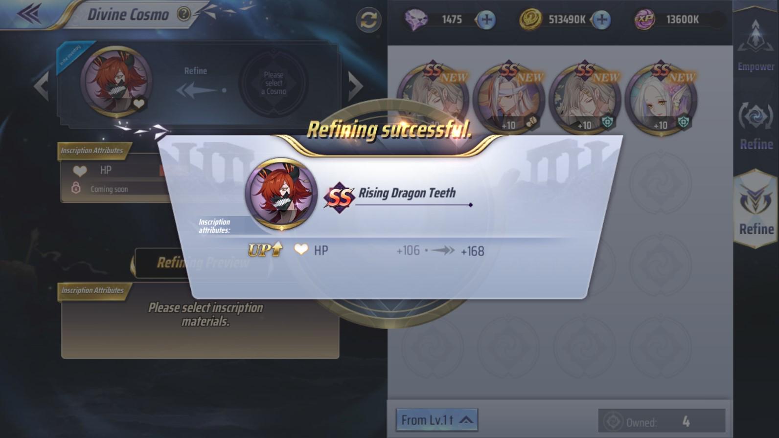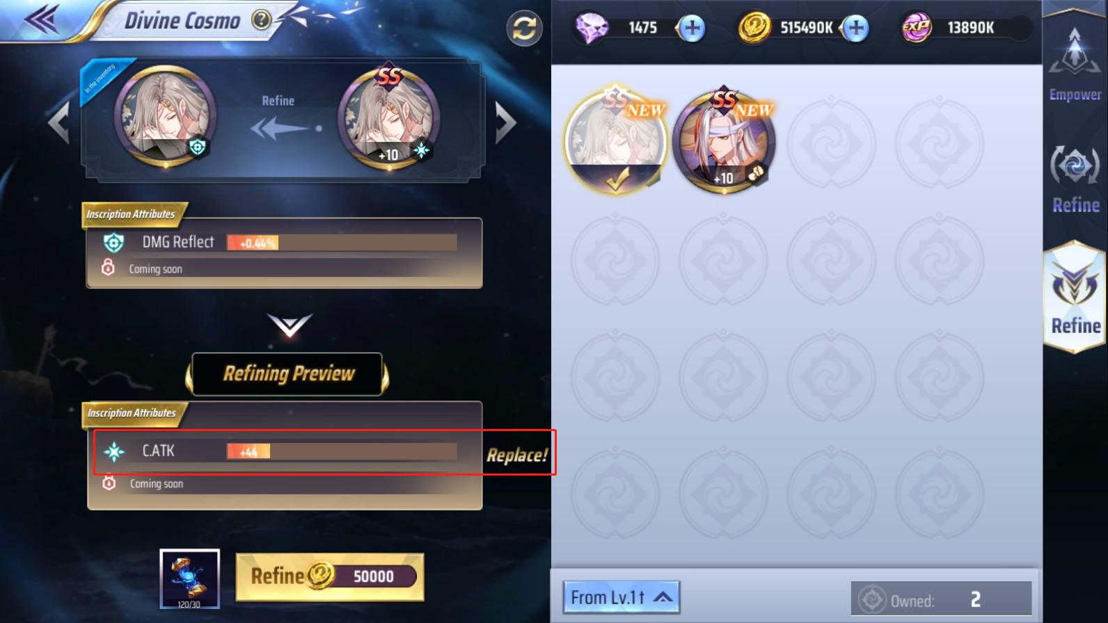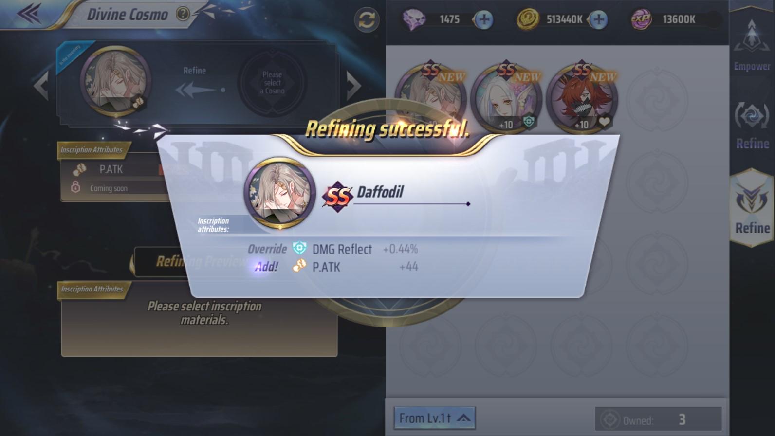 Inscribed Cosmos can be refined. Refinement costs an inscribed Cosmo that is of the same quality and slot of the Cosmo being refined, Gold, and Divine Essence (consumed Cosmo will disappear upon refinement).
