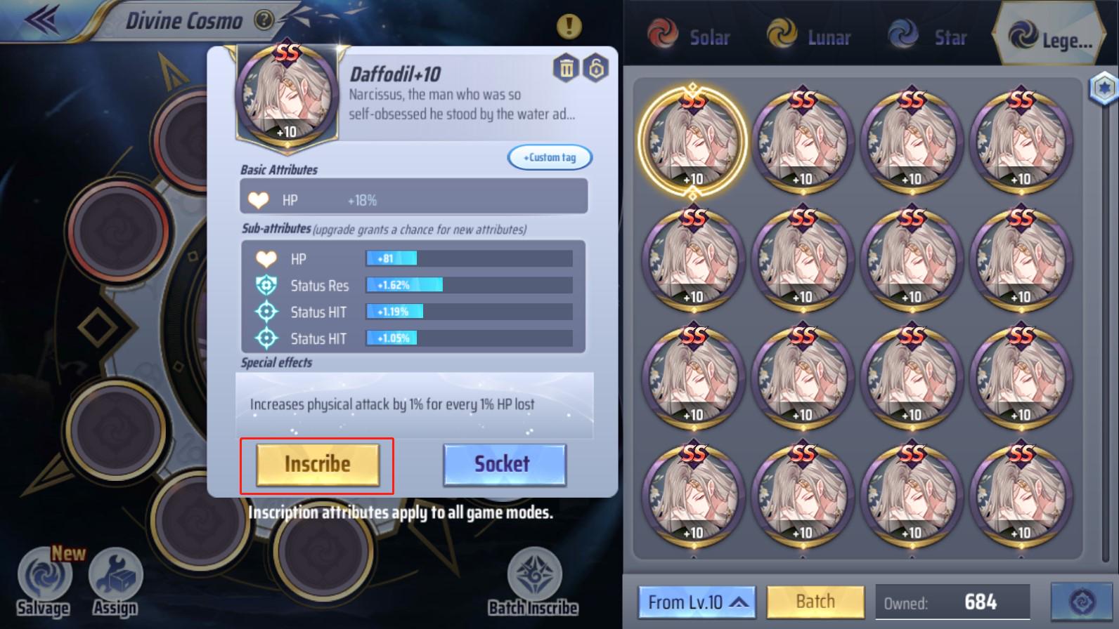 Inscription costs Cosmo Star Cores, Gold, and Cosmo EXP. Inscription cost differs across Cosmos of different qualities. As Cosmo quality increases from A to SS, inscription cost also increases correspondingly.